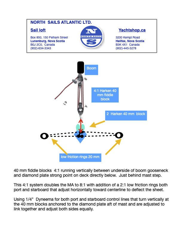 You see this type of in hauler system on a variety of boats. Farr 30, Sonar etc. Works well on Bn for light and medium breeze. Works like a Cunningham to make sure Sail cuts evenly. Of course in big breeze open up the leech.