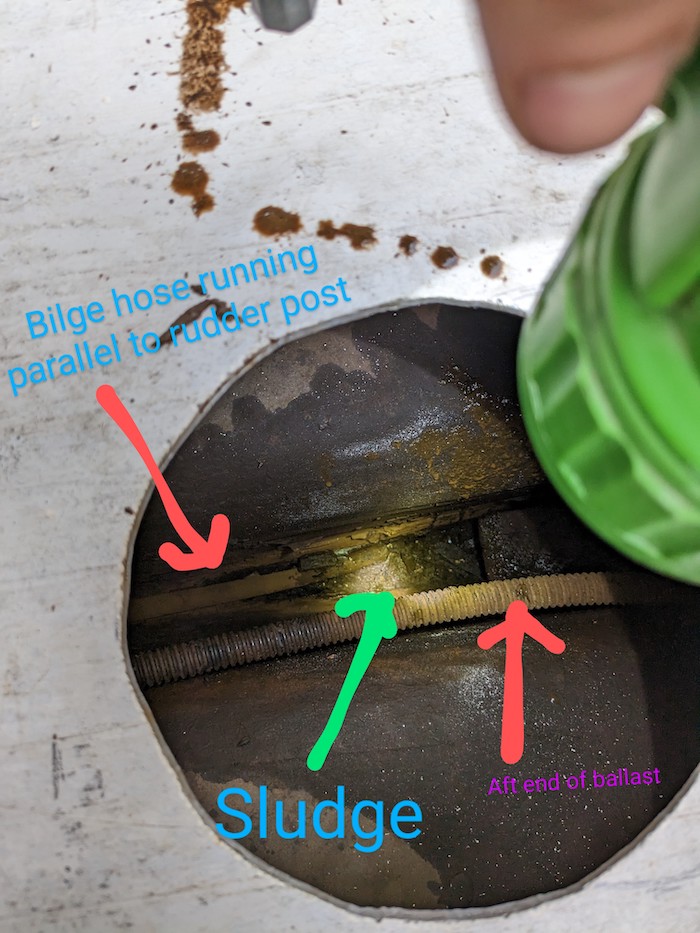 Note that there is a void ahead of the rudder bolts at the very bottom of the keel (where there is also no ballast). Note also the rather large cavity behind the ballast and in front of the rudder. Most McVays have plumbed a bilge pump hose that reaches down into this cavity. In theory, with enough diligence, this larger area can be kept dry. The small void at the bottom of the keel behind the ballast, however, is nearly impossible to keep fully dry. The plywood bulkheads of the boat which have become soft and flaky over the years, combined with whatever else may find its way into the bilge (duct tape, sandpaper, bits of line, you name it) will also eventually migrate into this lower pocket over time.